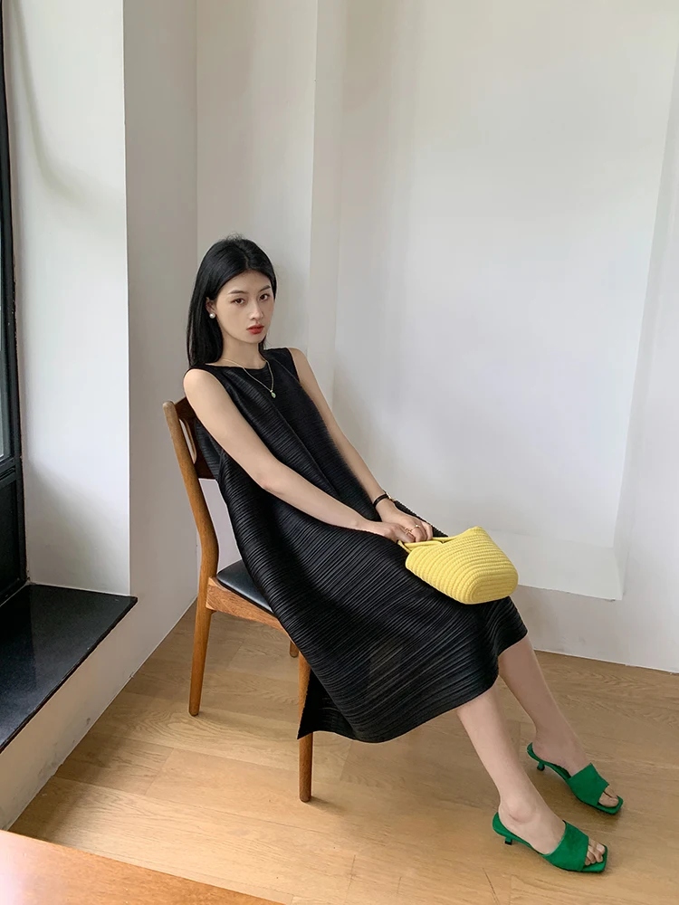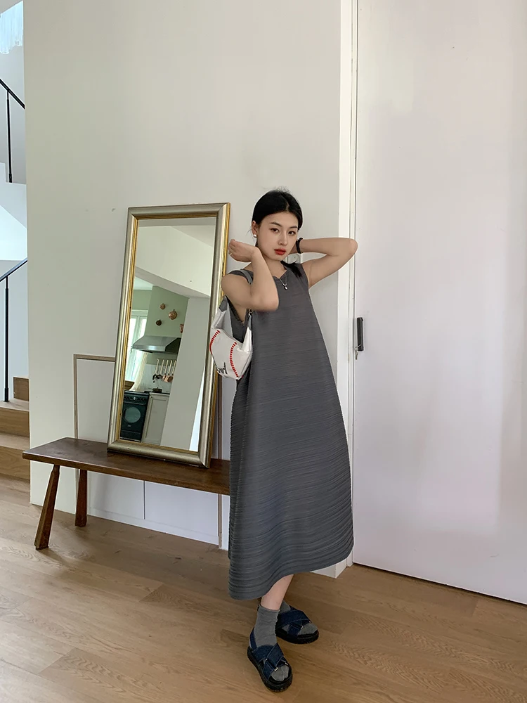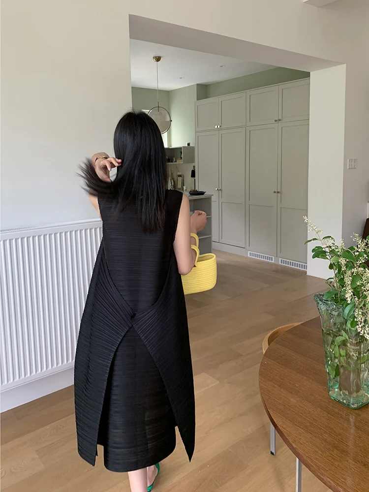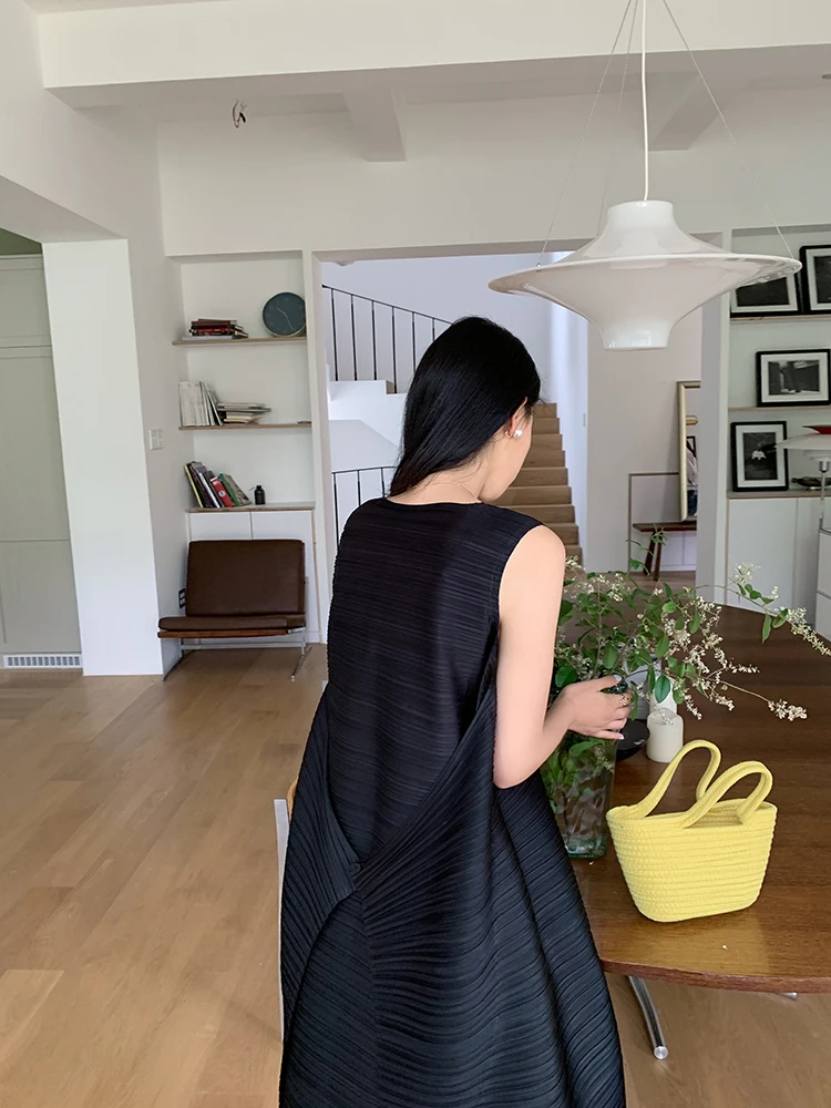 Embrace sophistication with the Lunarie Pleats Haute Dress, inspired by the timeless Miyake pleat aesthetic and reimagined for women who cherish comfort, effortless movement, and a striking look at every moment. This voluminous A-line dress, cut to the knee with a sleeveless design, is defined by elegant folds that create fluidity and a modern edge, turning any occasion into a scene of lightness and bold self-expression.